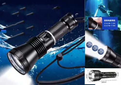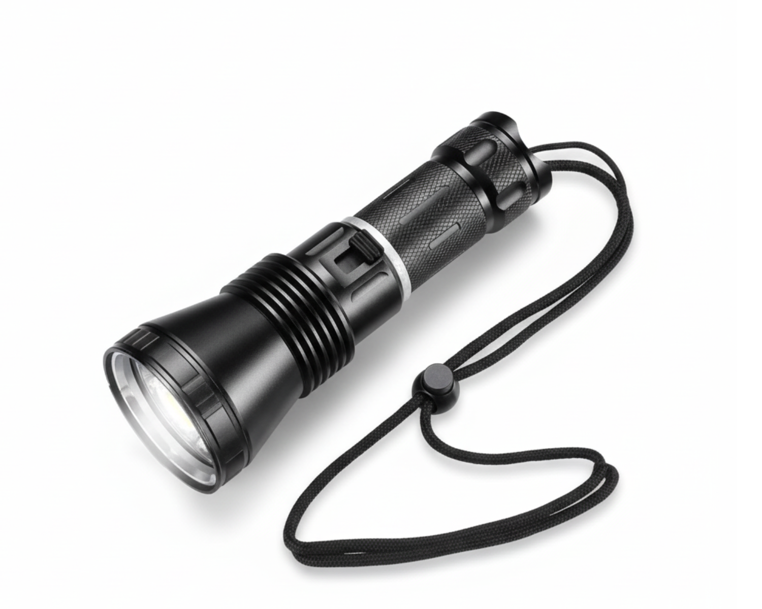 مزود ببطارية 26650، قابل للشحن، خفيف الوزن (285 جم) ومتين، مصمم للاستخدام تحت الماء أثناء الغوص، ويوفر إضاءة قوية وواضحة للرحلات البحرية والاستخدامات الخارجية.