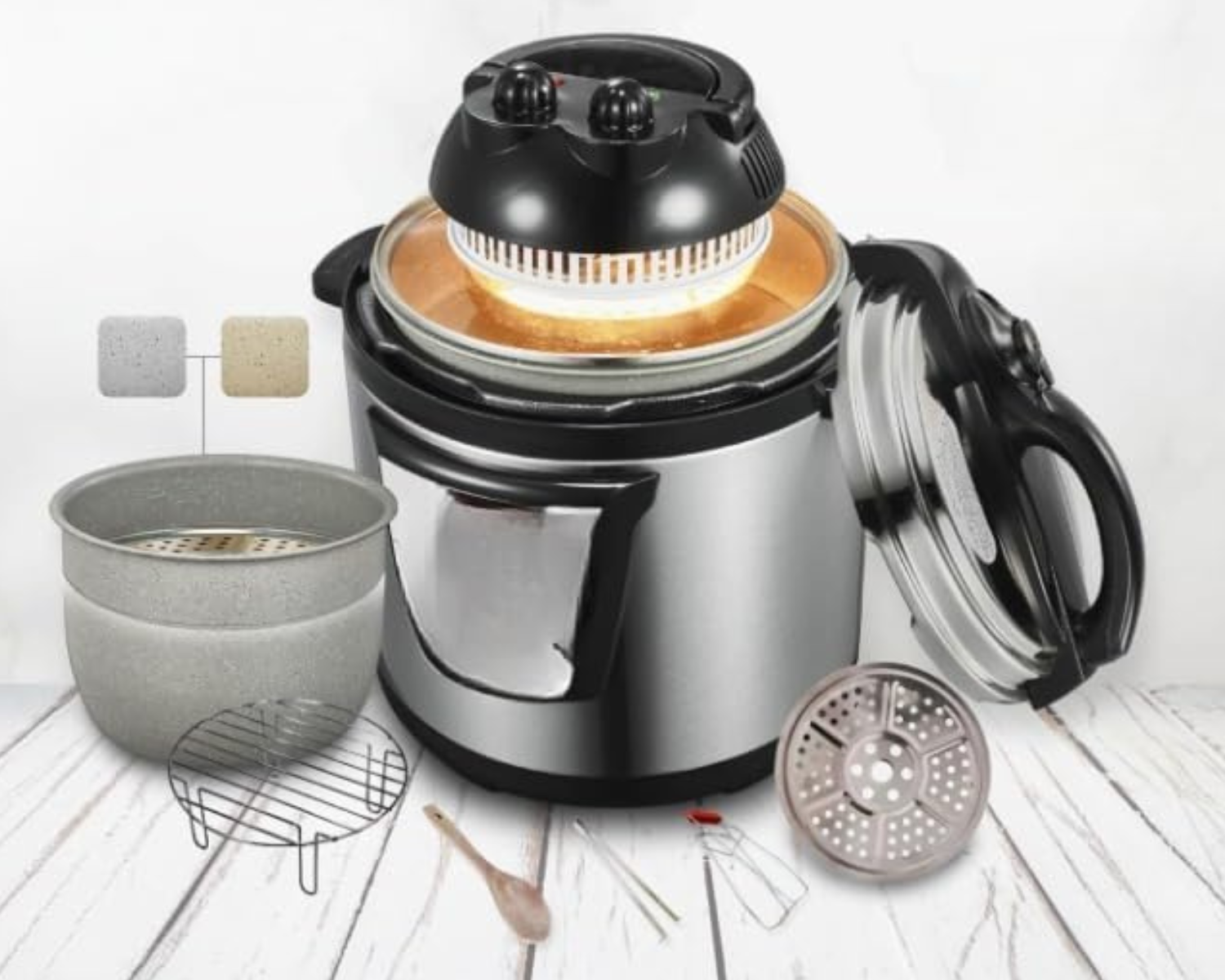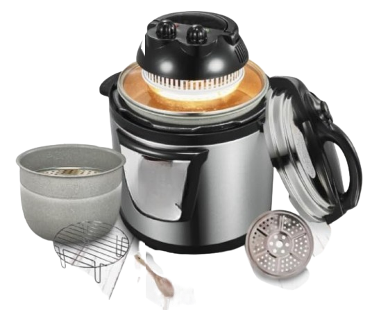 المادة: فولاذ مقاوم للصدأ + بلاستيكالسعة: 6 لتراتالقوة الكهربائية: 1000 واطاللون: فضينوع اللمسة النهائية: ستيلميزة خاصة: 2 في 1 – مقلاة هوائية وقدر ضغط كهربائي 💡 مميزات المنتج: وظائف مزدوجة 2 في 1: يجمع الجهاز بين المقلاة الهوائية وقدر الضغط للطهي السريع والمتنوع. سعة مناسبة: 6 لتر مثالية للعائلات الصغيرة أو للطهي لشخص واحد. 10 وظائف طهي مضبوطة مسبقًا: تشمل الأرز، الحساء، الفاصوليا، اللحوم، الدواجن، الأسماك، الزبادي، البخار والتعقيم. وظيفة البدء المتأخر: تحضير الطعام ليكون جاهزًا عند الوقت الذي تريده. وعاء داخلي من الستانلس ستيل: متين، سهل التنظيف وآمن للطعام. طهي صحي ومقرمش: وظيفة المقلاة الهوائية تستخدم الهواء الساخن لطهي الطعام مع نتائج مقرمشة ولذيذة. سهولة الاستخدام: تصميم عملي، مناسب للطهي السريع والمتنوع في جهاز واحد.