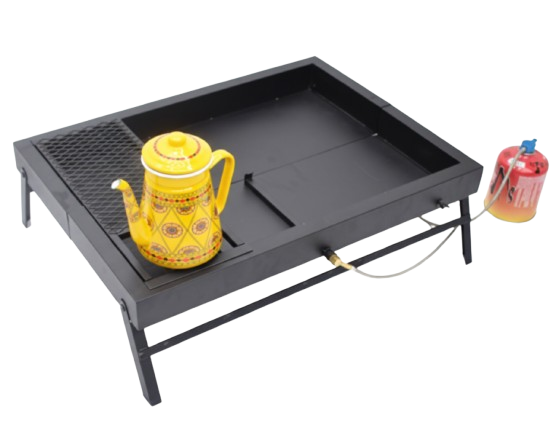 موقد متين مصنوع من معدن عالي الجودة بسماكة 1.2 مم، يعمل بالغاز والفحم معًا لتوفير تجربة شواء مرنة ومثالية للرحلات والنزهات. تصميم عملي يضمن توزيع حرارة متوازن وسهولة في الاستخدام والتنظيف