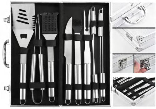 يتضمن 10 أدوات مصنوعة من الستانلس ستيل المتين، تأتي مع صندوق ألومنيوم لحفظ الأدوات وتنظيمها، عملي وسهل الحمل، مثالي للشواء في الرحلات والمناسبات الخارجية.