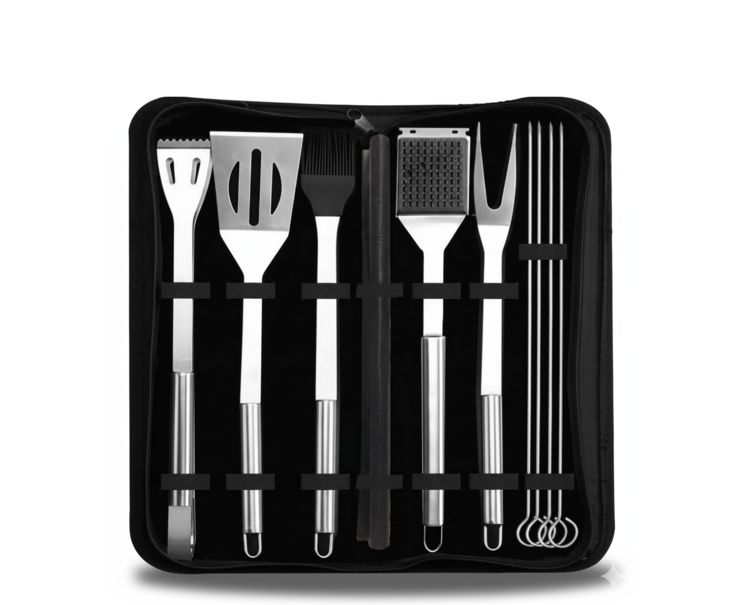 يتضمن 9 أدوات مصنوعة من الستانلس ستيل المتين، تأتي مع حقيبة تخزين عملية لحفظ الأدوات وتنظيمها، مثالي للشواء في الرحلات والمناسبات الخارجية.