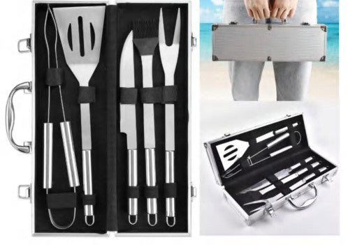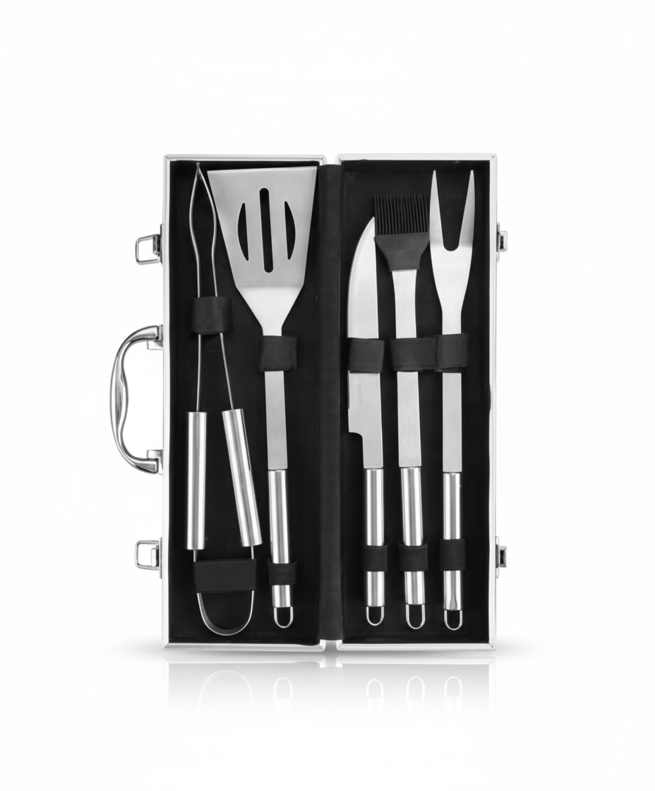 يشمل 5 أدوات مصنوعة من الستانلس ستيل المتين، مع صندوق ألومنيوم عملي لحفظ الأدوات وتنظيمها، مثالي للشواء في الرحلات والمناسبات الخارجية.