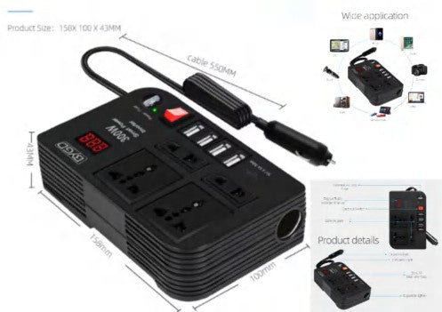 جهاز عملي لتحويل طاقة السيارة من 12 فولت إلى 220–240 فولت، مع شاشة رقمية لعرض جهد الإدخال والإخراج بدقة، مثالي لتشغيل الأجهزة الكهربائية الصغيرة أثناء السفر أو التخييم.
