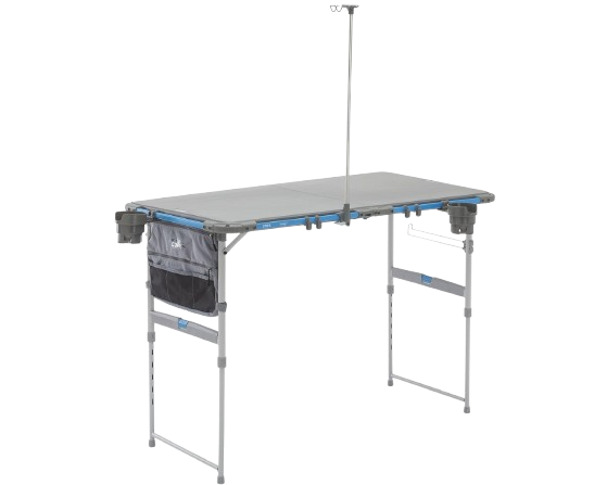 • طاولة تخييم مرنة: إطار فولاذي متين مع نظام Flex Rail المرشح للحصول على براءة اختراع، مزودة بحامل فانوس، أربعة مشابك قابلة للإزالة، وحاملي أكواب لتخصيص تجربة التخييم.