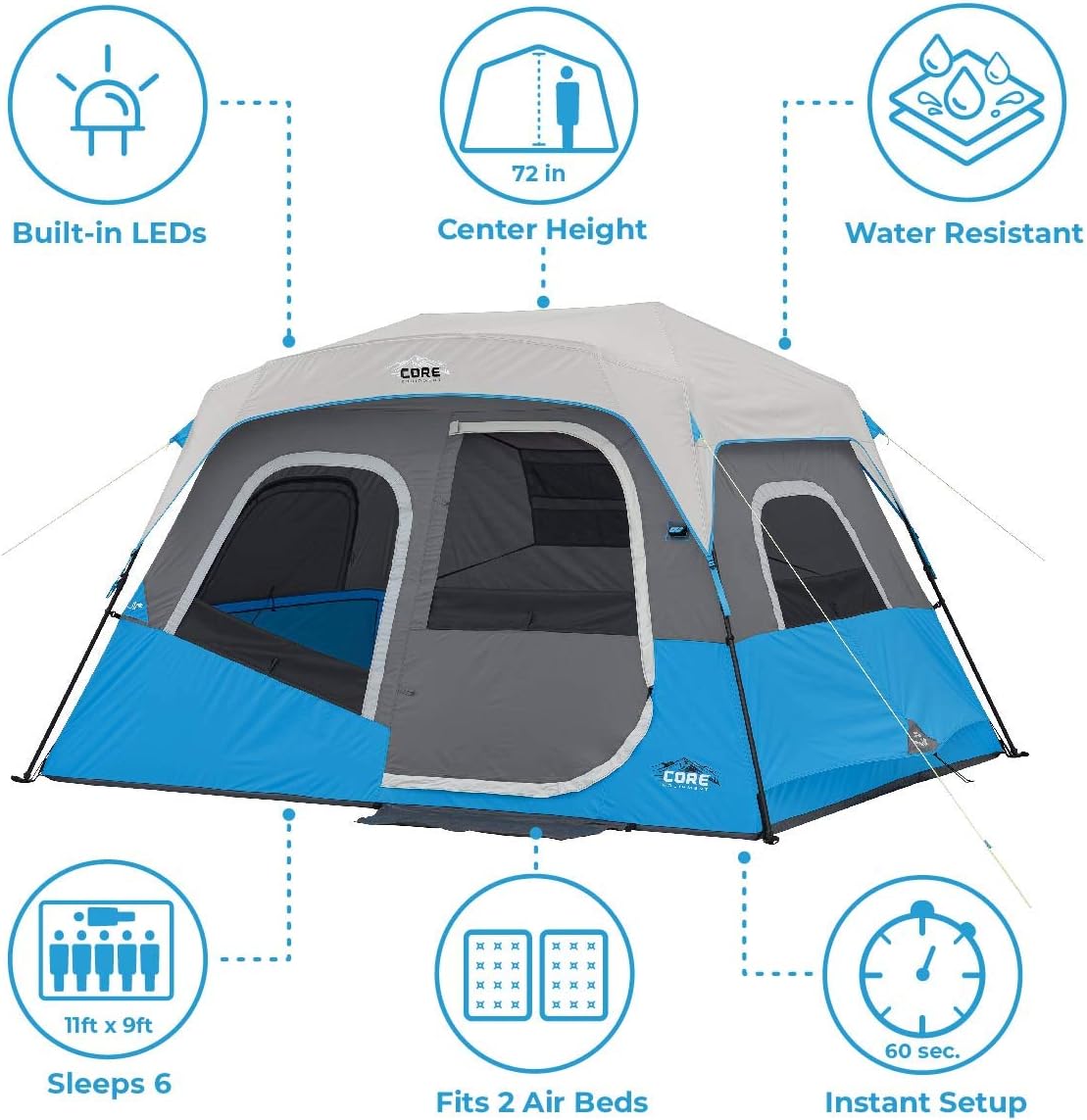 خيمة فورية مضيئة تتسع لـ6 أشخاص، مثالية للتخييم والتنزه في الهواء الطلق. تصميمها المستدير يمنح مساحة داخلية مريحة ويسمح بالتحرك بحرية داخل الخيمة.