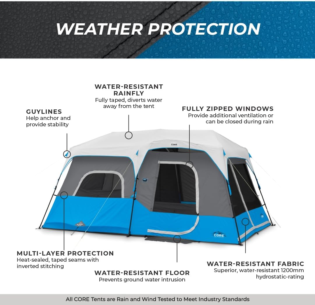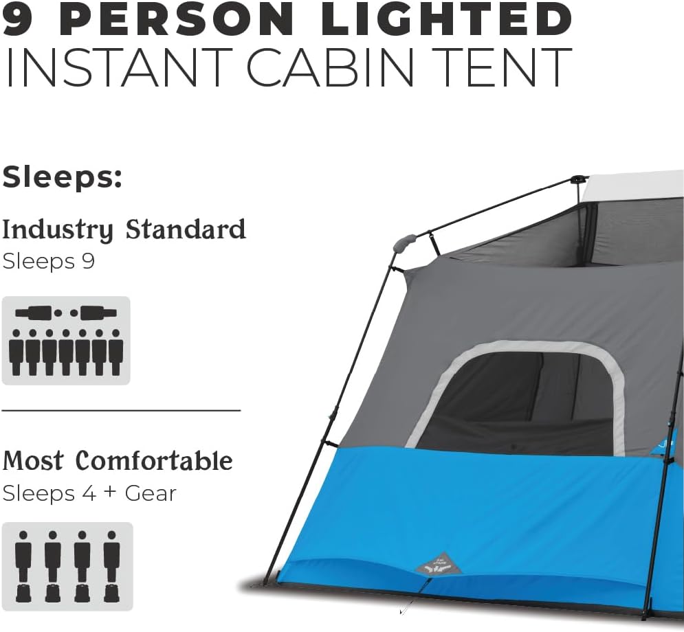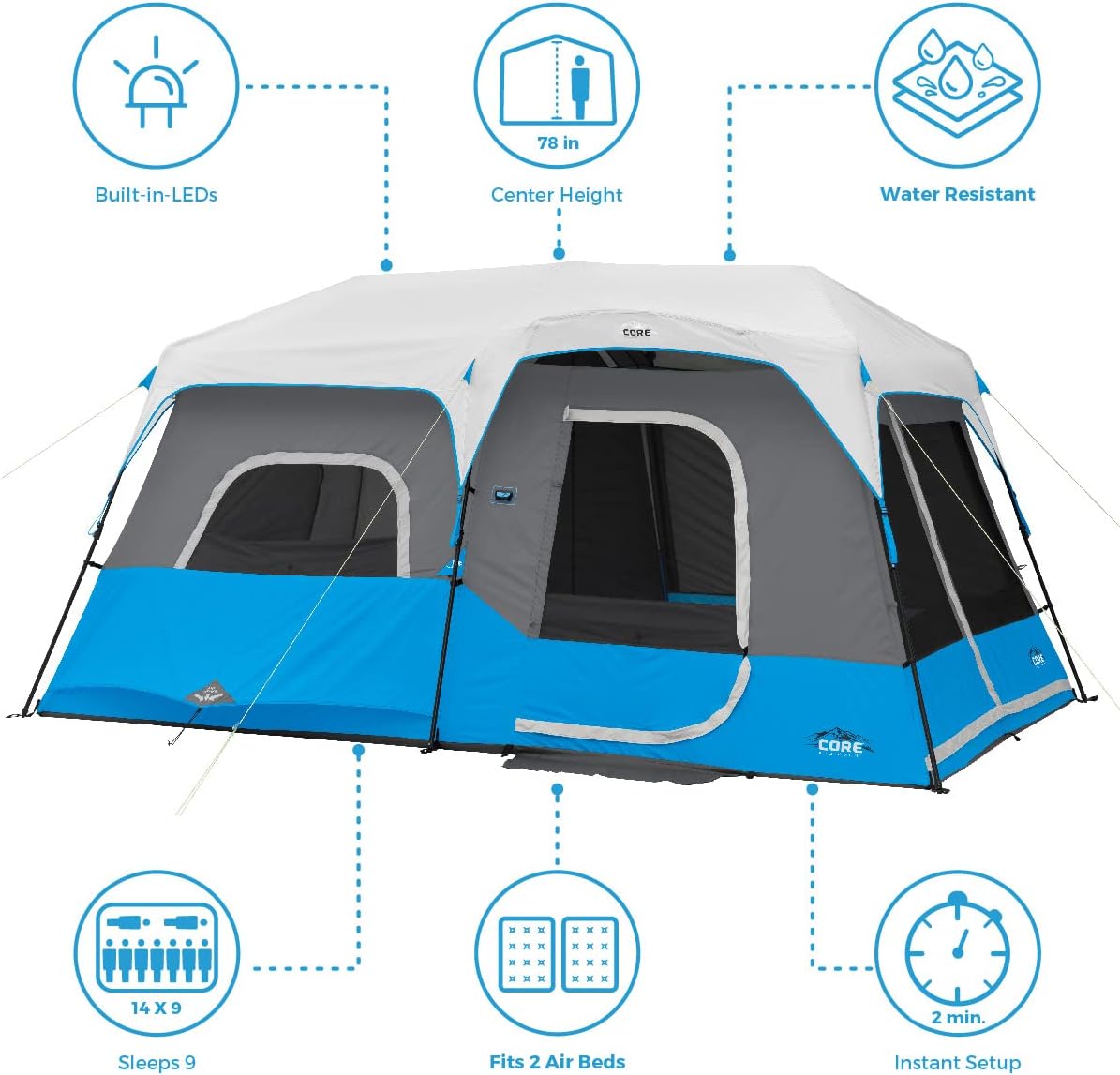 خيمة فورية مضيئة تتسع لـ9 أشخاص، مثالية للتخييم والتنزه العائلي أو رحلات السيارات. تصميمها يوفر مساحة واسعة وارتفاع مركزي 6.5 قدم لحرية الحركة داخل الخيمة.