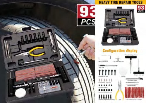 طقم متكامل لإصلاح الإطارات يحتوي على 93 أداة متنوعة لتغطية جميع احتياجات إصلاح الثقوب والشقوق بكفاءة عالية، مثالي للطوارئ أثناء السفر والاستخدام اليومي المكثف.