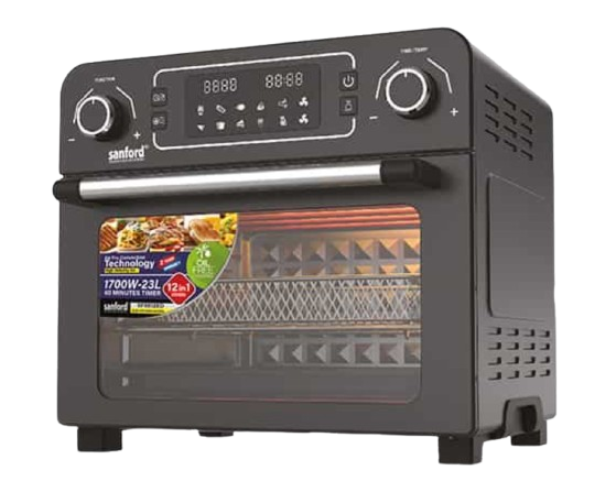 الملحقات: سلة المقلاة الهوائية ، 2 رف للجفاف ، صينية خبز ، رف خبز ، صينية فتات ، قفص دوار ، حامل سيخ ، قفص سمك ، رف جلب ، مشواة ، تونغ.