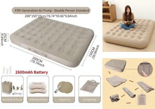 الوصف: مرتبة هوائية تلقائية بالكامل وخفيفة الوزن، سهلة النفخ مع مضخة مدمجة، توفر دعمًا قويًا وسعة تحمل عالية تصل إلى 300 كغ، مثالية للتخييم والرحلات، مع وسادة قابلة للنفخ وطقم إصلاح للطوارئ.
