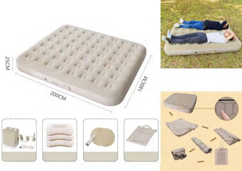 الوصف: مرتبة هوائية تلقائية بالكامل وخفيفة الوزن، سهلة النفخ مع مضخة مدمجة، توفر دعمًا قويًا وسعة تحمل تصل إلى 300 كغ، مثالية للتخييم والرحلات، مزودة بوسائد قابلة للنفخ وطقم إصلاح للطوارئ.